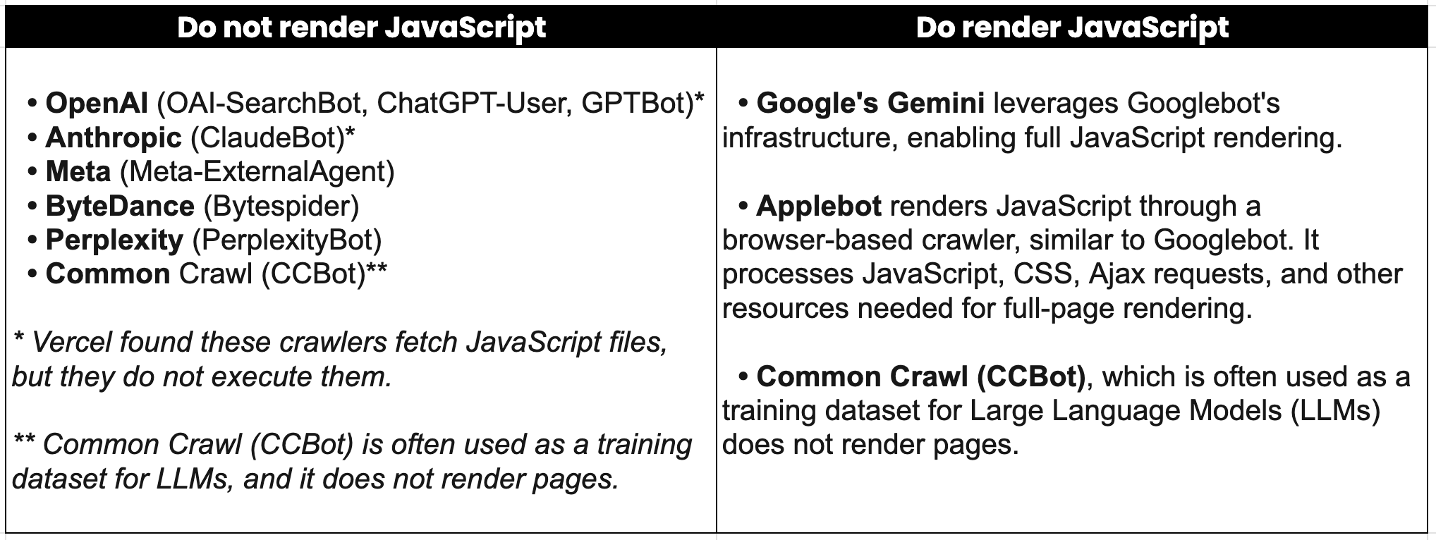 Most AI crawlers do not render JavaScript, Vercel’s study also found.