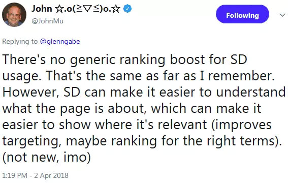 La déclaration de John Mueller s’aligne sur celle qu’il a faite en 2018 (dans un tweet supprimé depuis) où il a expliqué qu’il n’y a «pas de coup de pouce générique» à partir de données structurées.